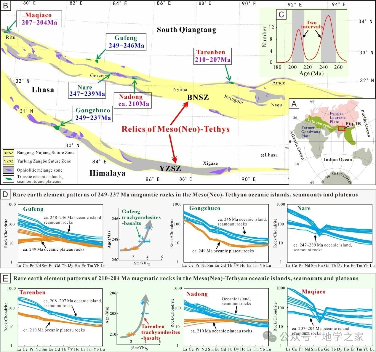 (1)基于岩石学、年代学和全岩地球化学研究,在青藏高原中(新)特提斯域中识别出249-237 Ma和210-204 Ma两期三叠纪地幔柱(热点)型洋岛(海山)/洋底高原。依据年龄和地球化学特征,将每期洋岛(海山)/洋底高原岩浆岩进一步划分为两组:①早期具有较低(Sm/Yb)N比值(<3)的洋底高原阶段岩浆岩;②晚期具有较高(Sm/Yb)N比值(>3)的洋岛(海山)阶段岩浆岩(图1)。