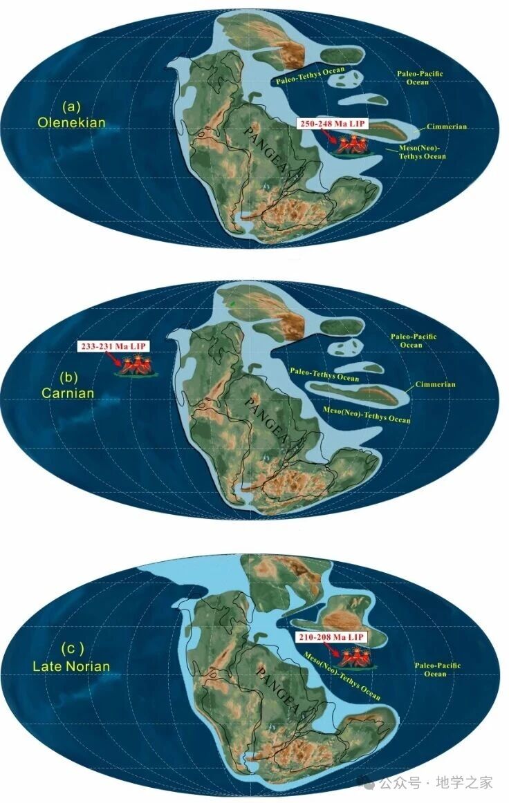 图2 三叠纪250–248 Ma,233–231 Ma和210–208 Ma海相大火成岩省喷发事件