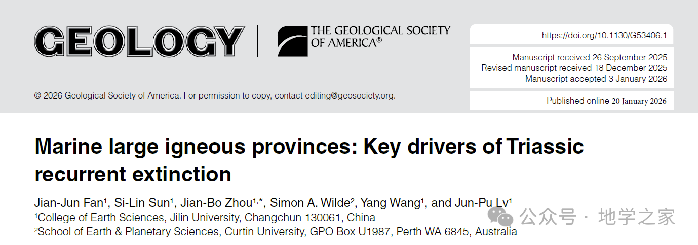 论文链接:Jian-Jun Fan(范建军), Si-Lin Sun(孙思霖), Jian-Bo Zhou†(周建波), Simon A. Wilde, Yang Wang(王洋), and Jun-Pu Lv(吕峻浦). Marine large igneous provinces: Key drivers of Triassic recurrent extinction. Geology, (2026), online,//doi.org/10 .1130/G53406.1