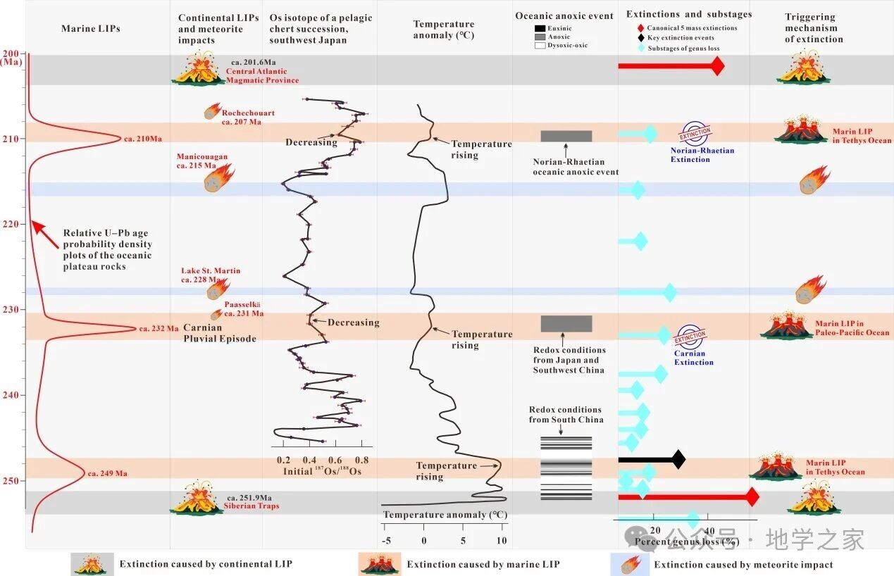 图3 三叠纪海相大火成岩省、大陆大火成岩省、陨石撞击事件与生物灭绝
