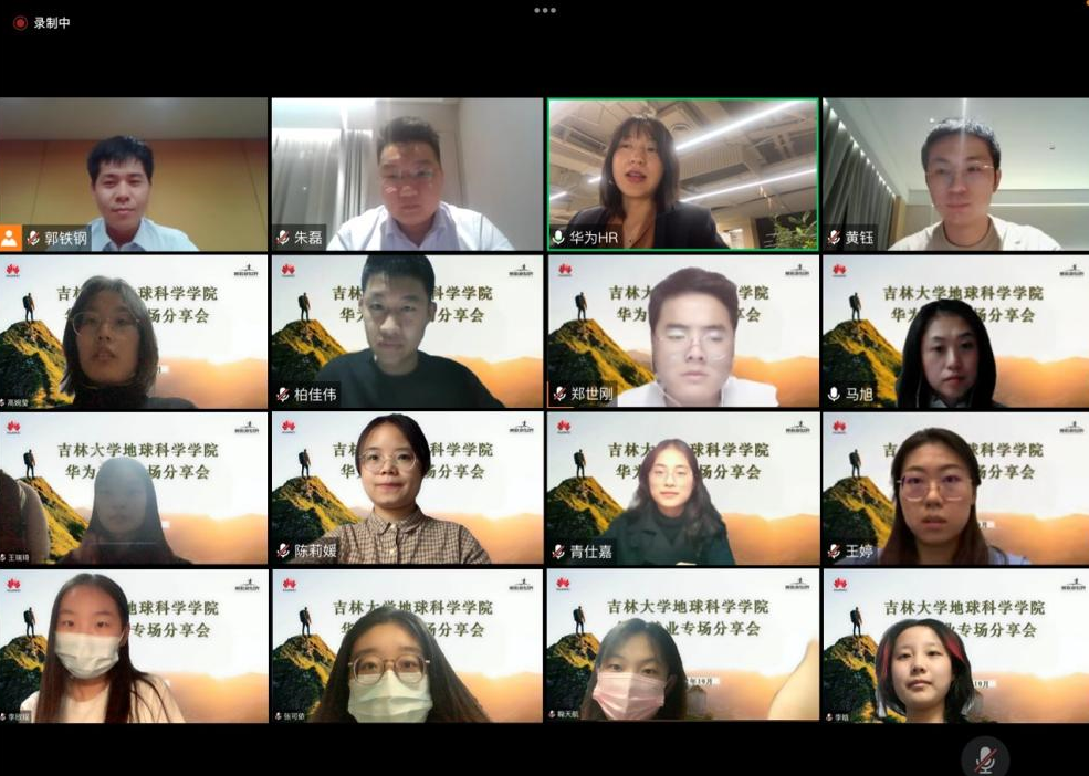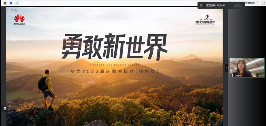 与华为技术有限公司吉林代表处在云端开展了2023届华为校招就业专场分享会。华为吉林人力资源部部长胡光,华为中国地区校招负责人段彩云,华为内蒙古代表处运营商客户经理黄钰、华为辽宁代表处政企客户经理朱磊参加了本次分享会,会议由学院党委副书记马旭主持。