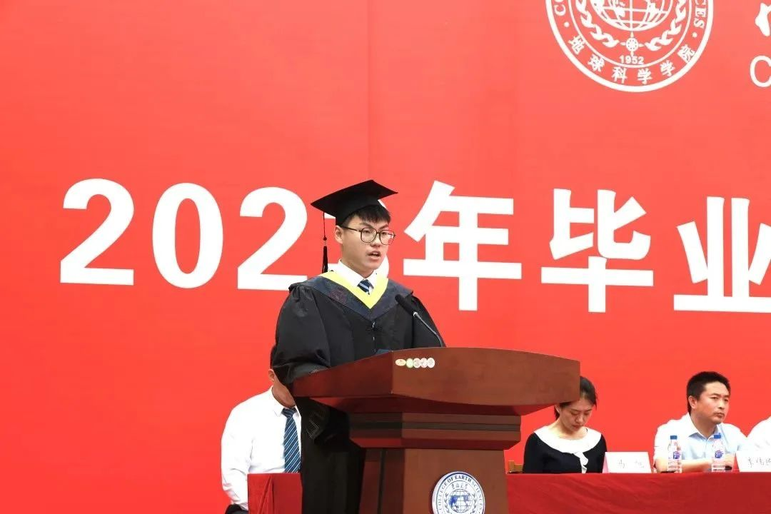 本科生代表刘春龙饱含对老师们的感激之情,满怀热情讲述了在这里对地学院蓬勃发展的见证;讲述了自己在这里积淀了广博浓厚的文化内涵;讲述了自己在这里砥砺了团结坚毅的思想品格。他以风华正茂奋烈时、少年壮气犹未尽祝愿同学们保持少年人的澄澈,奔赴星辰大海。同时对恩师与母校送上了诚挚的祝福。