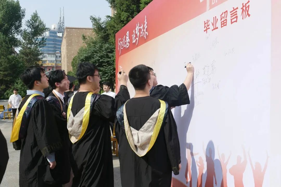 典礼开始前,毕业生们早早地穿好学士服整理好仪表,来共同见证这难忘的时刻,为青春致贺,相互整理学士服、拥抱、合影,在毕业留言板上留下自己的名字。