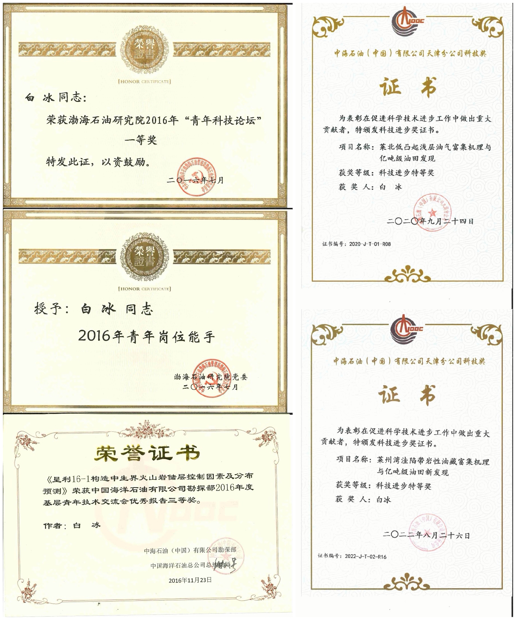 白冰入职之初便在师父的指导下系统梳理了渤海海域中生界火山岩钻井,建立渤海中生界火山岩优质储层发育模式,寻找中生界有利油气区位,2016年,骨干参与渤海南部海域垦利16-1油田的发现,在中生界火山岩获良好油气发现,测试取得高产。所获认识在渤海石油研究院青年科技论坛获一等奖,集团公司基层青年技术交流三等奖,并获2016年度渤海石油研究院“青年岗位能手”称号。工作十年期间获多项院级、分公司级、集团公司级奖励,并于2015年至2019年作为公司代表参加天津投资贸易洽谈会,宣传公司形象。