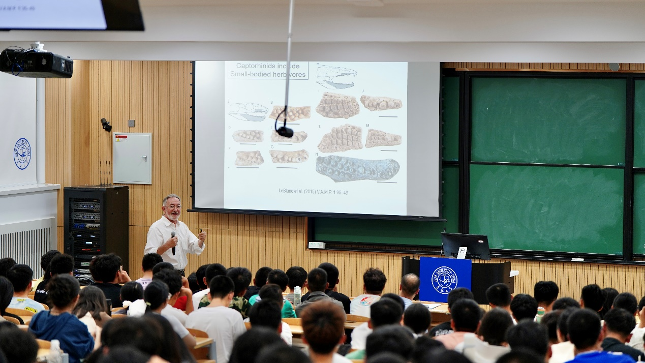 外聘杰出教授罗伯特.赖兹在敬信楼F6阶梯教室为2023级本科新生开展题为“如何研究远古爬行动物:以2亿8千万年前的大鼻龙为例”的科研启蒙讲座,学院副院长柳蓉、恐龙演化中心副主任陈军、地层古生物教研室主任李晓波、2023级辅导员杨凯凯及全体本科新生参加本次讲座。