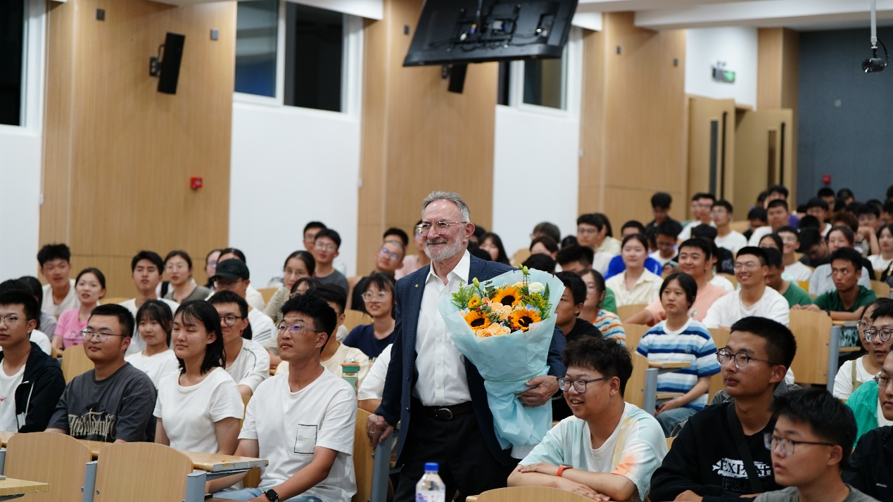 会后,全体23级新生向赖兹院士献花,提前祝贺赖兹教授中国教师节快乐!赖兹院士与全体学生合影留念。