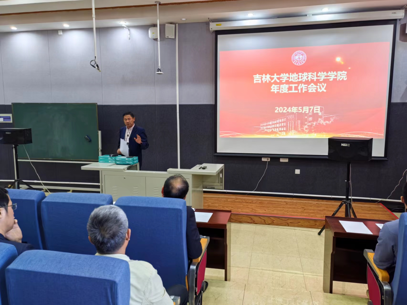 在鸽子楼125教室召开年度工作会议,全体教职工参加会议。会议由党委书记杨洲主持。