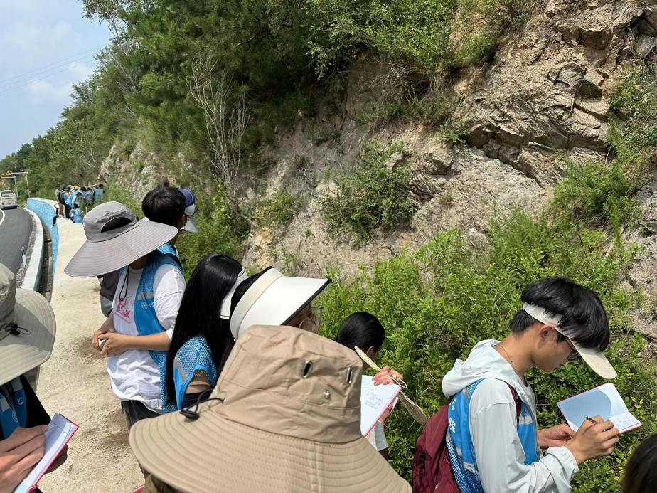 2023级长春周边认识实习队伍来到了四平市石岭镇,开始了新一天的野外实习。在实习老师的带领下,2023级全体本科生对该地区的典型岩石类型和常见构造现象进行了观察和学习。