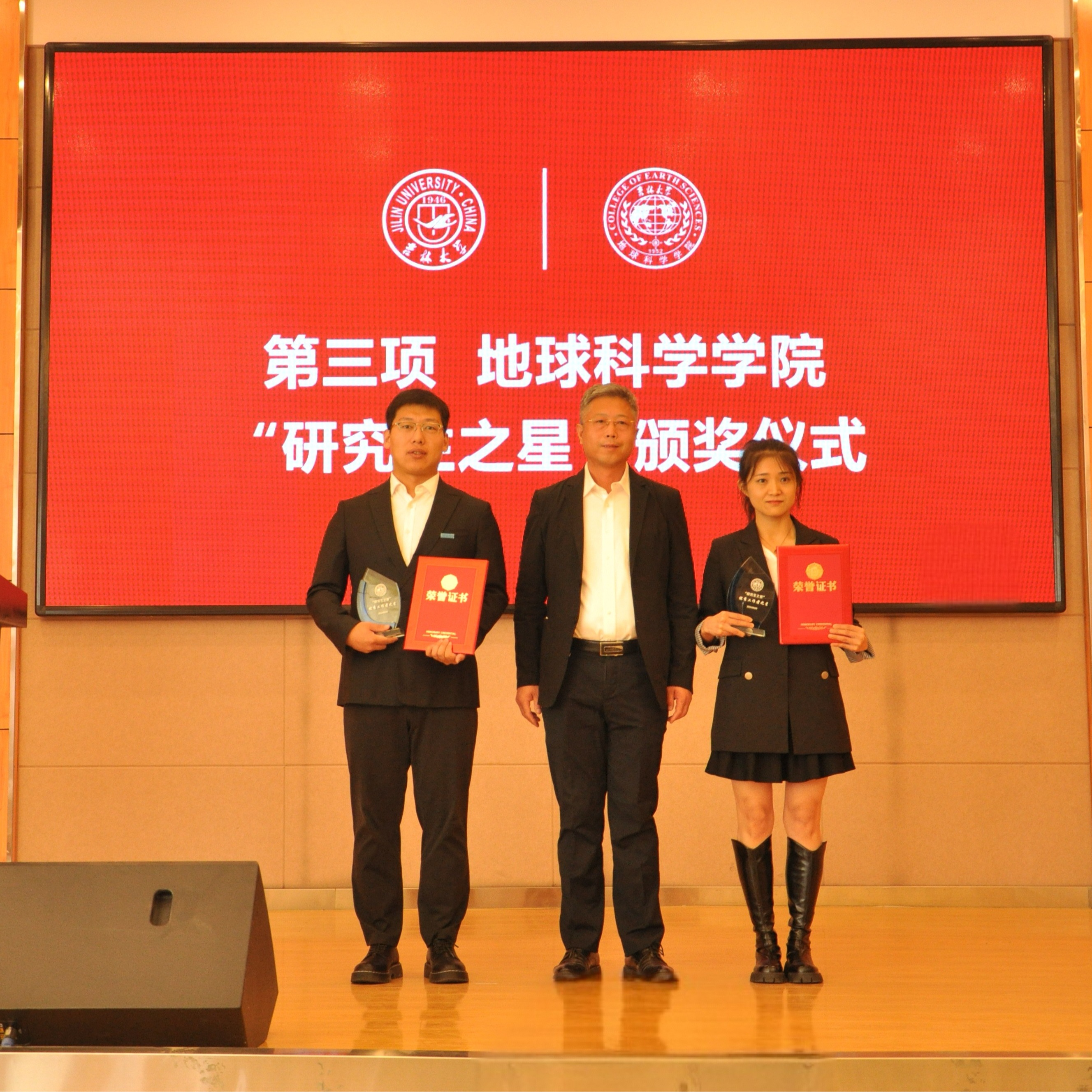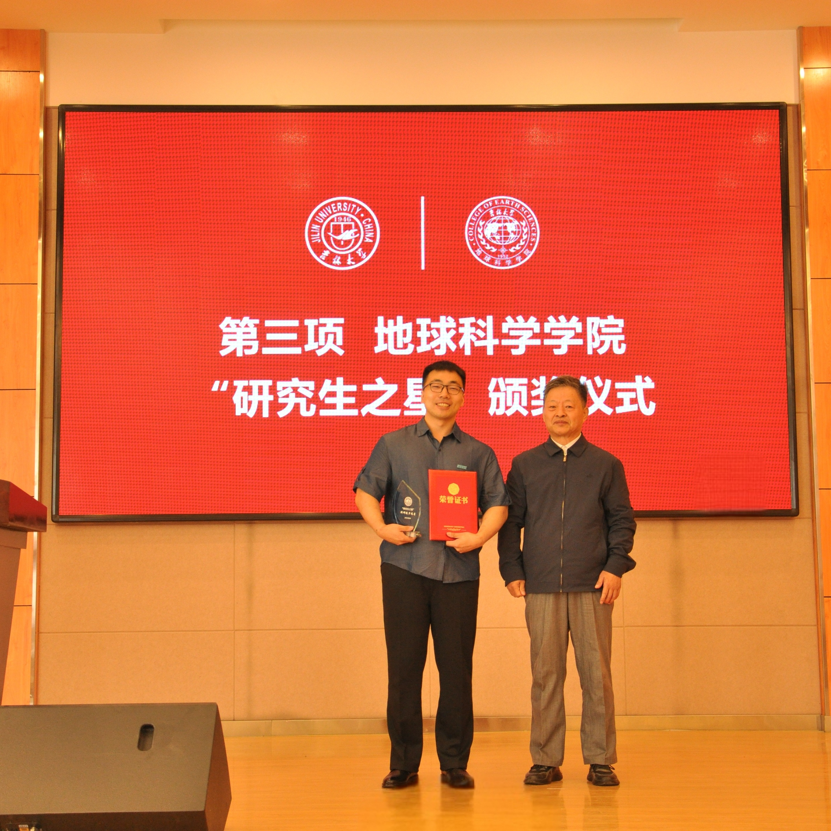 “研究生之星”的决定》。学院党委书记杨洲、学院院长单玄龙,专业学位培养指导委员会主任委员王璞珺、行政副院长苗广文、地质学系主任李世超、国土资源系主任王冬艳、博士生导师杨晨分别为“研究生之星”颁发荣誉证书和奖杯。