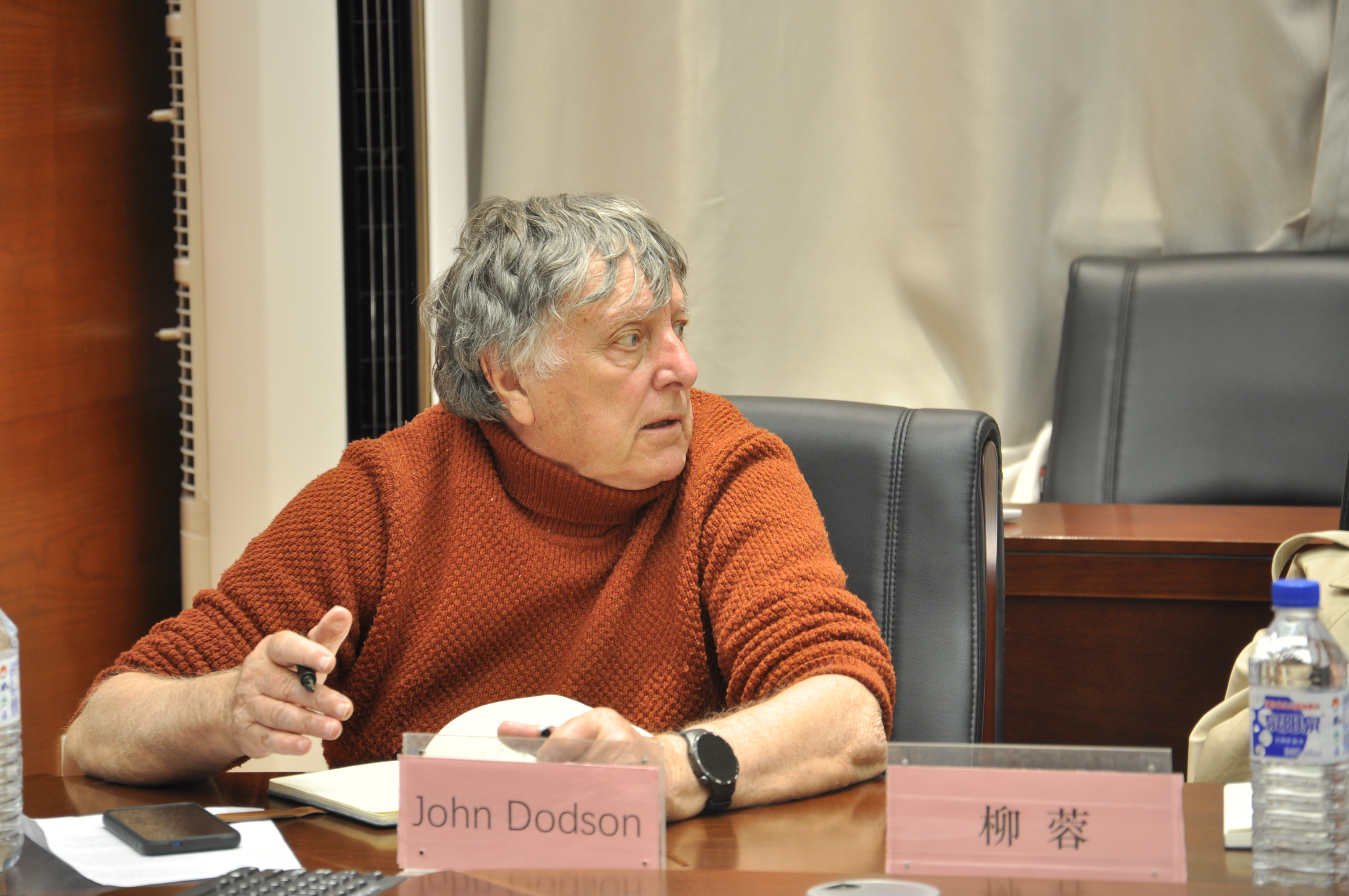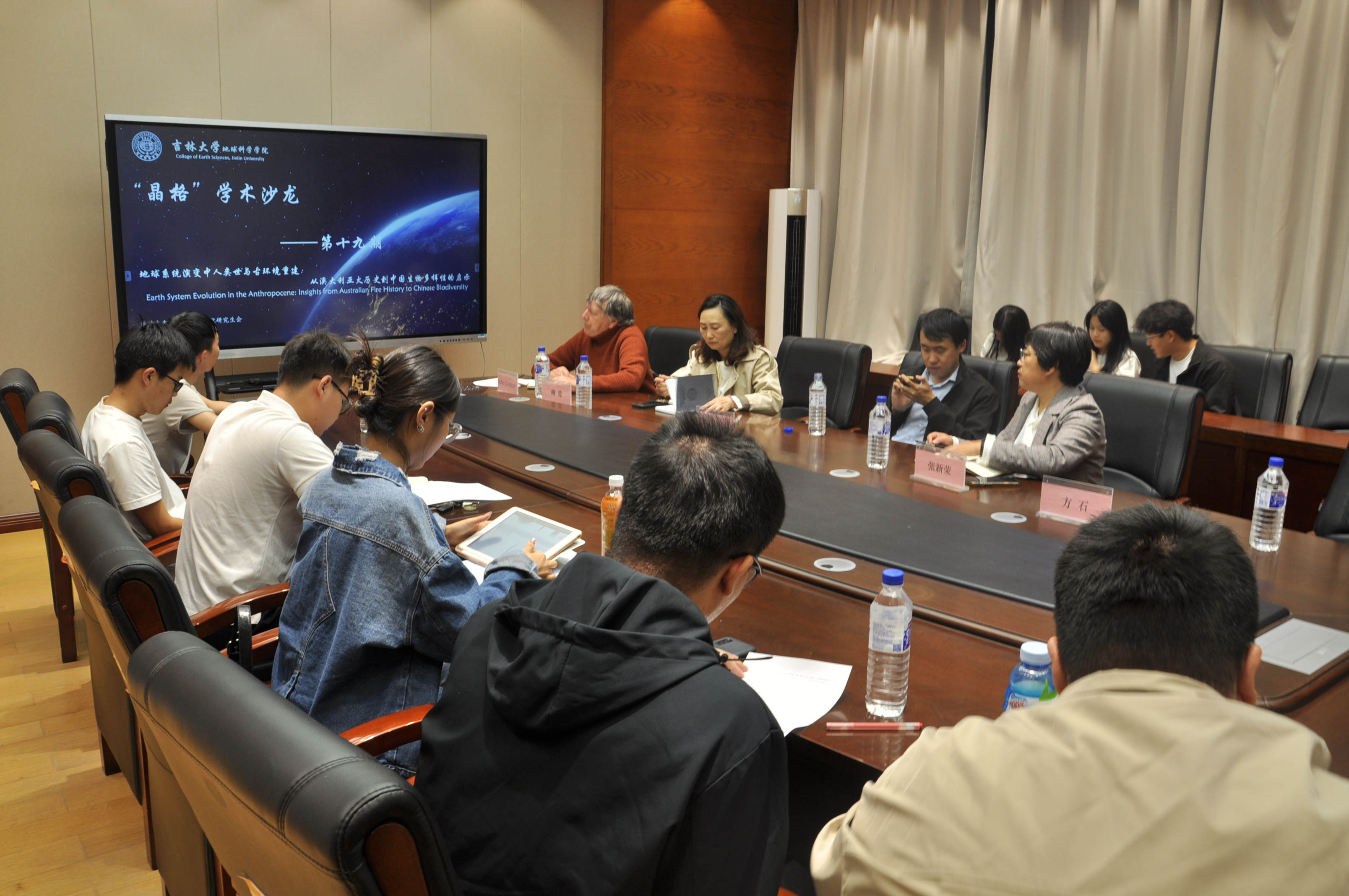 对约翰·道森教授到来表示热烈的欢迎。之后,数位同学围绕地质与古环境前沿课题、聚焦不同方向展开汇报:刘高飞通过分析炭屑、分子化石与沉积记录,揭示早白垩世野火事件对古气候环境的影响;刘春龙、霍元勃、龚艳、艾常荔、陆祉薇、张浩、张海洋借助热模拟、碎屑沉积与粒度证据,探讨煤组分氧化、盆地古气候演化及冲积平原演变规律;胡钦芝、刘嘉康、郁杭玉、夏超、毕研威结合河流地貌、低温热年代学与地震剖面,研究构造隆升、地震发震机制及湖泊有机质—植硅体耦合关系。研究生们凭借其深厚的理论根基与科学的研究方法,呈现了具有创新性的阶段性研究成果,体现了他们对前沿科学问题的系统性探索与深刻思考。