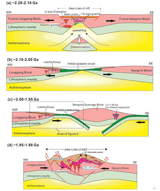 综合上述研究,提出胶-辽-吉造山带在古元古代期间应经历了裂解-俯冲-碰撞过程:即(1)古元古代早期华北克拉通东部陆块的加厚岩石圈发生拆沉作用,进而导致软流圈上涌,致使华北克拉通东部陆块伸展裂解形成陆内裂谷,形成一套火山-沉积建造,并伴随A型花岗岩和基性岩的形成;(2)随后,持续拉张导致规模有限的初始洋盆出现,东部陆块裂解为龙岗地块和狼林地块,并在龙岗地块南缘形成被动陆缘环境,沉积大石桥组巨厚的碳酸盐岩建造;(3)~2.0-1.88 Ga,在哥伦比亚超大陆汇聚大背景下,受狼林地块南缘俯冲作用影响,之前形成的胶辽吉小洋盆扩张受阻,开始发生向南的低角度俯冲,最终导致狼林地块和龙岗地块碰撞造山并形成胶-辽-吉造山带,期间伴随有较弱的同碰撞埃达克质岩浆活动;(5)~1.88-1.80 Ga,胶-辽-吉造山带进入到造山后伸展垮塌阶段,伴随强烈的岩浆活动及深熔作用(图2)。