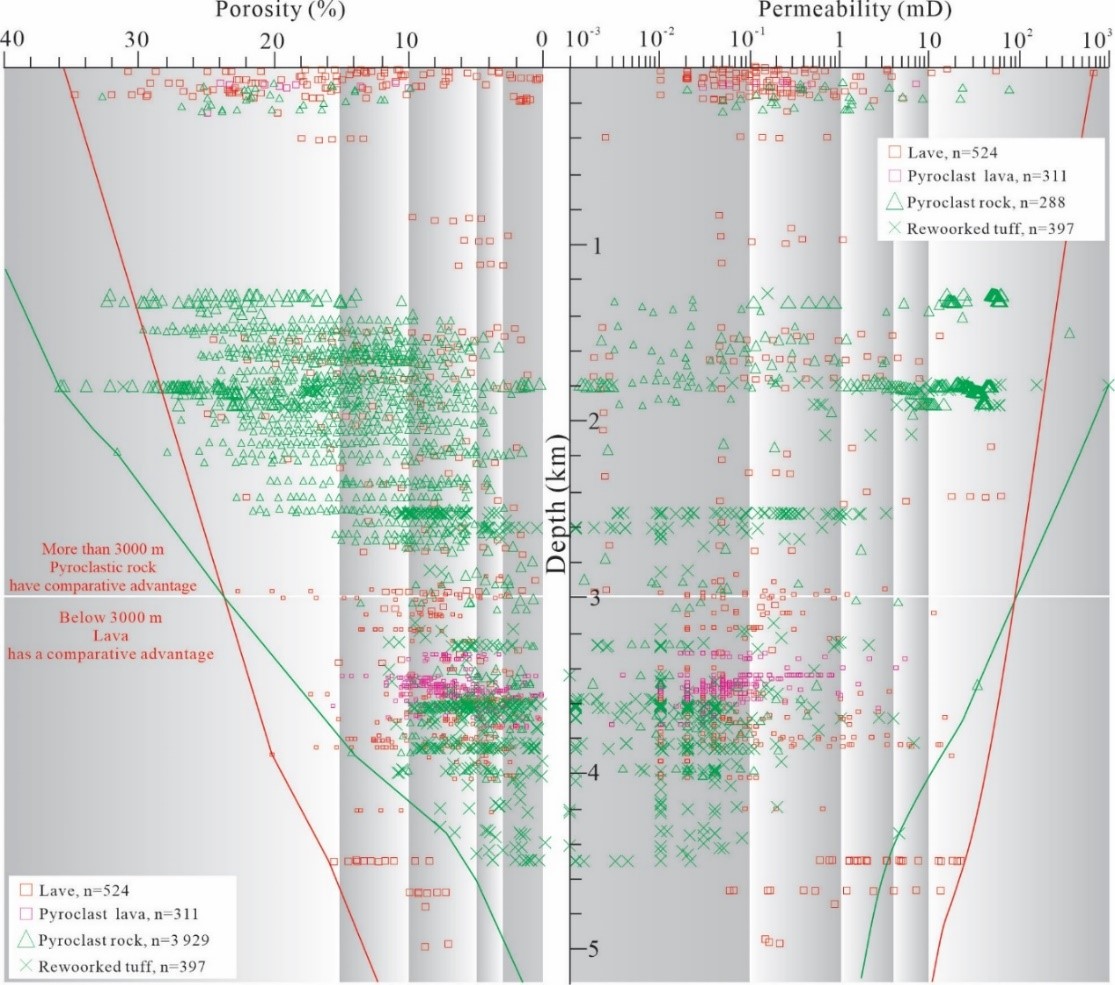 熔岩的孔隙度和渗透率随埋深增大的减少幅度小于火山碎屑岩和沉火山碎屑岩;熔岩的孔隙度、渗透率最大值在深部大于火山碎屑岩和沉火山碎屑岩;通常埋深在3000m之上时火山碎屑岩和沉火山碎屑岩可具有较好的储层物性,埋深在3000m之下时熔岩可有高孔隙带存在,具有相对好的物性(图1)。