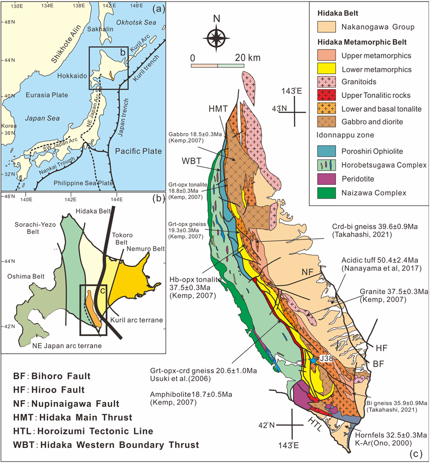 (3)Hidaka泥质麻粒岩的两期变质事件与区域岩浆作用具有很好的时间耦合性:① ~37Ma的角闪岩相变质时代与日本北海道同期的钙碱性岩浆事件(~37Ma)相一致,此时构造体制转换已经启动,该变质作用应与太平洋板块俯冲作用有关;② 24–19Ma的麻粒岩相变质与我国东北东部OIB型玄武岩(~21Ma)、日本海的MORB型玄武岩以及日本北海道的弧型玄武岩岩浆事件(~22Ma)一致,并与日本北海道同期的辉长岩、堇青石花岗岩的形成时代(19.0–17.9Ma)相吻合,此时日本海已经打开,该麻粒岩相变质事件与弧后伸展背景下幔源热物质上涌有关。