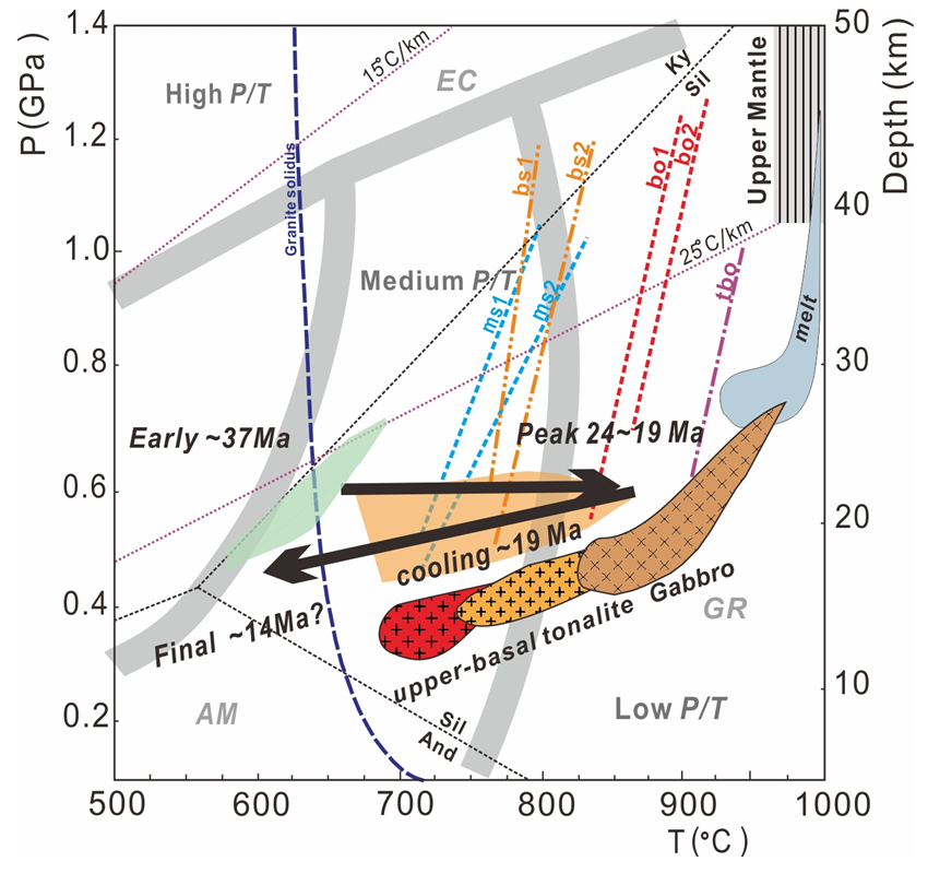 (2)Hidaka泥质麻粒岩中两期矿物组合分别记录两期变质事件:①早期角闪岩相变质,其峰期条件为6kbar/620–670 °C,变质时代约为37Ma;②晚期麻粒岩相变质,P-T轨迹表现为等压升温至6kbar/850°C的峰期条件后发生近等压冷却,对应的峰期变质时代为24–19Ma,冷却时代为 14Ma (图3)。