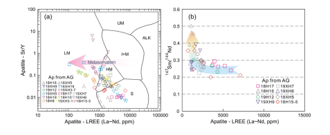 图2 经历晚期构造热事件改造的花岗岩中磷灰石的微量元素和Nd同位素组成。(a)源岩类型判别图(O’Sullivan et al., 2020);(b)147Sm/144Nd比值随LREE含量的变化