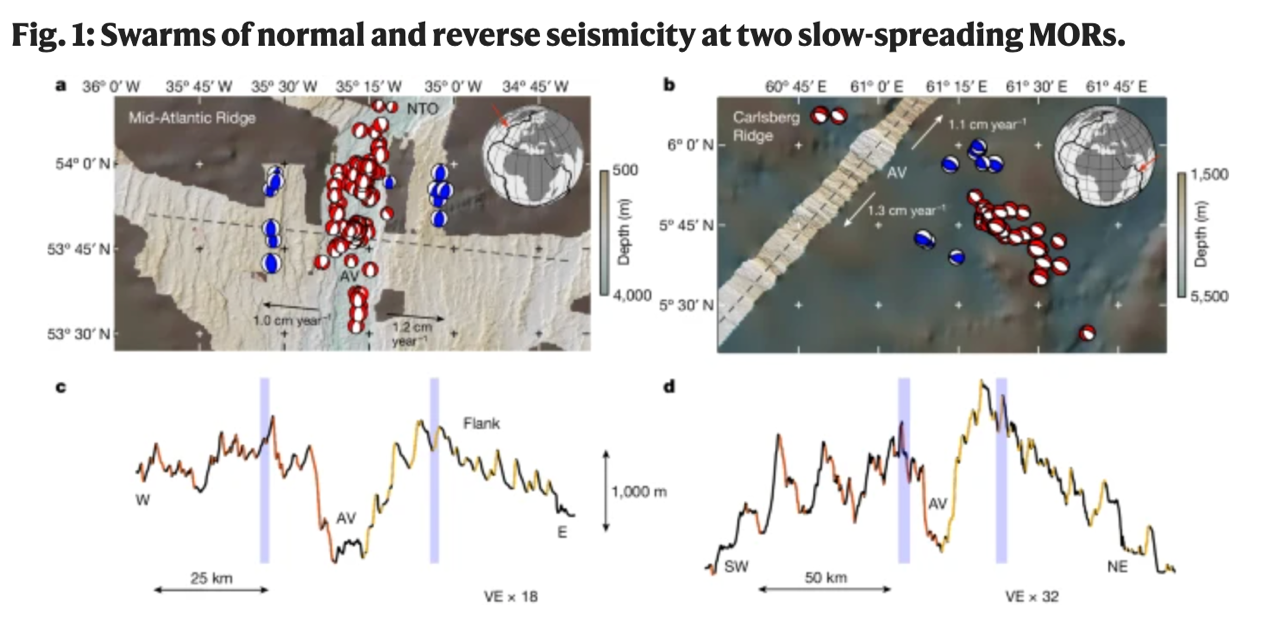 在2022年9月26日,位于北纬54°的北大西洋洋中脊发生了一个震级大于4级的正断层地震活动。该地震事件持续了大约80小时,并发生了从北到南的迁移。在该地震事件向南迁移的过程中,在距离新生火山轴以东15公里处的一个断层面上发生了一次5.1级的逆断层地震,表明新生大洋中脊正在发生构造缩短。在2022年9月29日至2023年1月4日期间,又发生了11次震级高达5.9级的逆断层地震事件,这些地震活动对称地分布在新生火山轴两侧大约15公里处的两个狭窄区域内(图.1a)。受到该次地震活动的启发,作者们发现早在2014年11月,在西北印度洋的卡尔斯伯格洋中脊上也发生了类似的地震序列(图.1b)