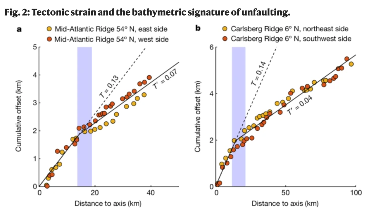 为了检验这种构造缩短的可靠性,作者们进一步通过海底地形解译分析构造应变量与离轴距离之间的关系。地形分析的结果显示,在检测到逆冲地震的两个区域,构造应变量(伸展量)会在离轴大约15公里处发生一个明显的减小(图2)。这种构造伸展量的急剧减小也表明构造缩短过程的存在,并且地形上显示的构造缩短位置与发生的逆断层地震事件位置在空间上重合。通过对全球已有公开多波束海底地形数据的洋中脊进行类似的分析,作者们发现大部分具有中央裂谷的对称型慢速-中速洋中脊均在地形上表现出类似的特征:在离轴一定的范围内会发生构造缩短。