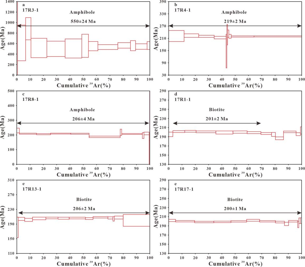 1. 对布列亚地块~935 Ma角闪岩开展了角闪石40Ar/39Ar年代学研究,获得了550 ± 24 Ma的40Ar/39Ar坪年龄(图1a),首次确证了布列亚地块也经历了晚泛非期变质作用,进一步从变质时代角度证实了布列亚地块和佳木斯-兴凯地块属于同一个微陆块。