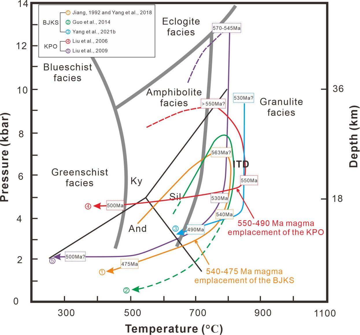 图2 布列亚-佳木斯-兴凯地块(BJKS)和Kunnga-Pinjarra造山带(KPO)变质作用P-T-t轨迹对比图