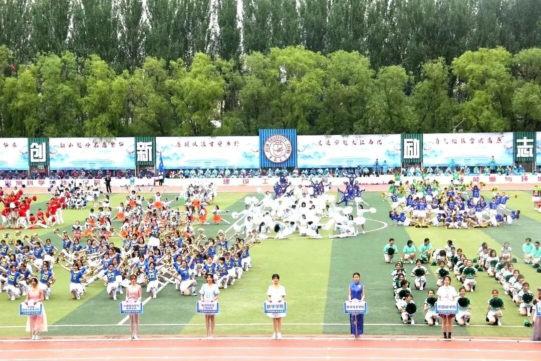 第60届运动会正式开幕。在八极拳的队伍离场后,各学院的啦啦操表演队上场。
