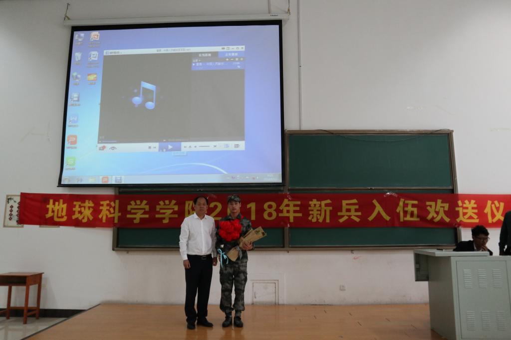 首先,杨洲书记为应征入伍的新生——2017级资源勘查工程的胡嘉诚同学佩戴了“光荣入伍”的大红花及纪念品。希望他在军营中磨砺自己,刻苦训练,为国家、为学校争光。