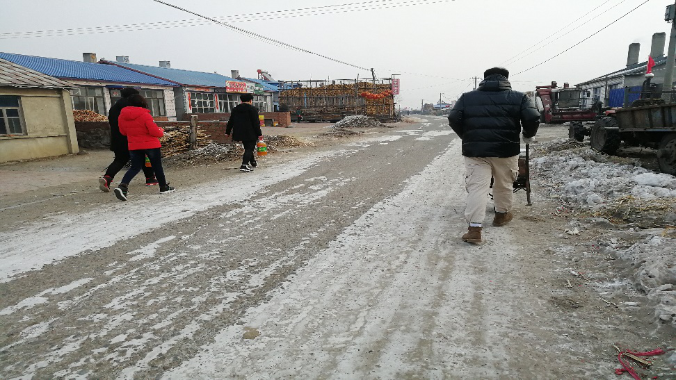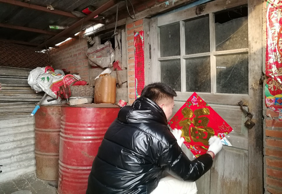2月13日,团队前往连大爷夫妇家和他们夫妇一起聊起家长里短。连大爷两口一起生活在这个靠近村子边上的小院子里,家里挂了些旗,还有新贴上去的对联,年味十足。连大爷家是村里的贫困户,屋子中摆设十分简约,进屋是厨房,然后就是带有一间大炕的卧室,冰柜、洗衣机、电视机都在这个屋子里,还有一个十分狭小的屋子,有一张单人床,大娘说那是外孙子回来。住的地方。几个男生帮着大爷把要掉了的春联重新贴了一下,帮大娘扫扫地,收拾收拾厨房,帮着弄弄炉灰。干活之余连大爷谈到现在农民的生活是真的难,物价是十年前的两到三倍,供孩子上学、治病甚至达到了十年前的五六倍,而今年粮食的价格已经快要跌到十年前的水平了,猪肉的价钱已经跌到了十年前的水平了,尤其是今年的猪肉价钱是近几年最低水平。因为赚钱不易,所以他们画的每一分钱都格外仔细。