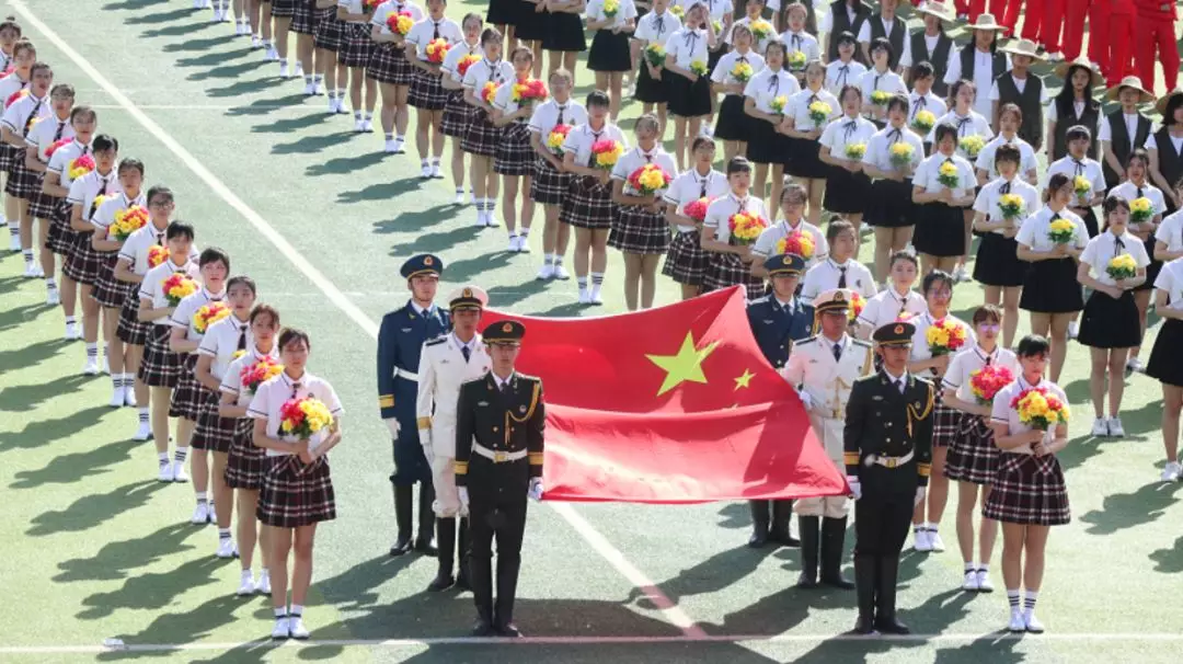 检阅结束,各个方队集合在田径场中央。在护旗手的簇拥下,伴随着慷慨激扬的义勇军进行曲,五星红旗冉冉升起,在场全体人员集体起立,面向国旗行注目礼,共唱国歌。接下来奏唱校歌,“人比山高,脚比路长”正好契合了今天运动会坚持不懈的宗旨,短短一分钟多的校歌再次将大会引向了高潮。