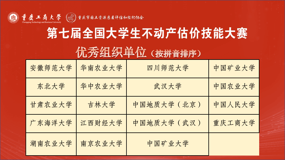 第七届全国大学生不动产估价技能大赛决赛在重庆举行。此次大赛以“面向中国式现代化的不动产估价"为主题,由教育部高等学校公共管理类专业教学指导委员会主办,重庆工商大学公共管理学院承办,全国22家行业机构协办。大赛共吸引了包括中国人民大学、中国农业大学、武汉大学、 日本av中文字幕