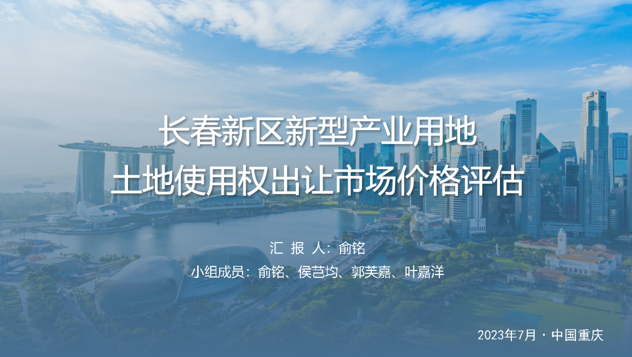 第一组俞铭(组长)、郭芙嘉、叶嘉洋、侯芑均的作品为《长春新区新型产业用地土地使用权出让市场价格评估》。新型产业用地是政府为优化重点建设项目、吸纳高新技术产业和城市高质量发展项目落户,为深化供给侧结构性改良而采取的合理配置土地资源的制度。估价项目选题具有创新性,思路具有现实性和普适性,估价方法具有综合创新性,旨在为长春市后续新型产业用地土地使用权市场价格评估的评估方式提供参考,通过“创新”二字深深打动评委老师。