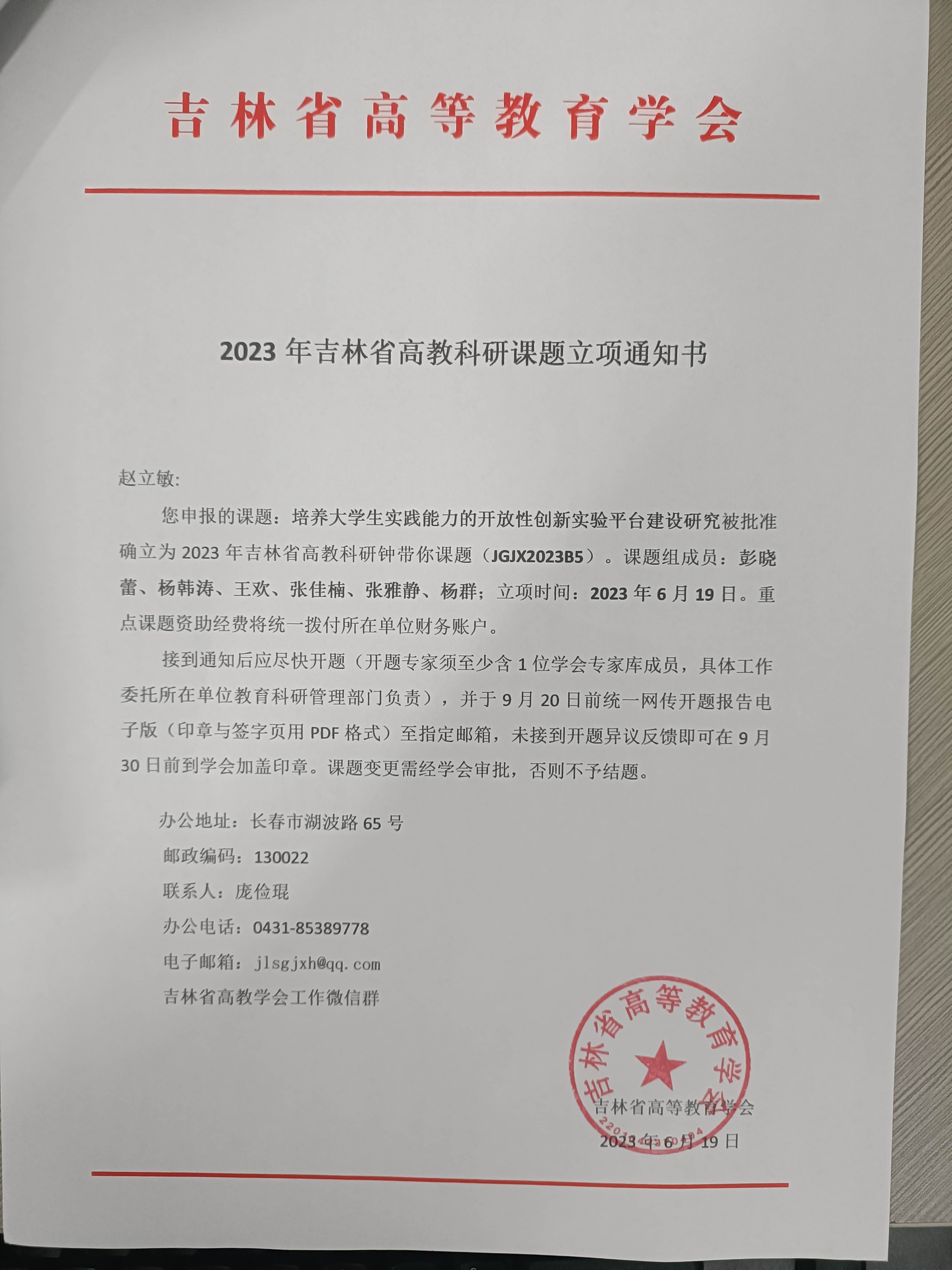 经各高校申报,省高教学会组织专家组初评、复评和终评,中心赵立敏负责的“培养大学生实践能力的开放性创新实验平台建设研究”项目,被确立为2023年 日本av中文字幕 高教科研课题重点项目,项目编号JGJX2023B5。2023年 日本av中文字幕 高教科研课题重点项目共立项58项,其中重点课题6项、重点自筹课题10项、一般课题42项。相关信息可在吉林省高等教育学会官方网站(