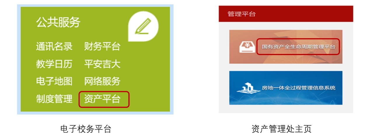 国资平台可从电子校务平台、资产管理处主页访问或通过/访问,该平台在校园网运行,外网可通过vpn进行访问。