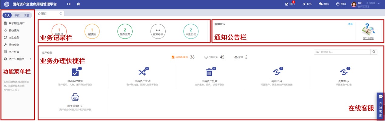 国资平台秉承用户办理业务“只进一扇门”的管理理念,系统主页