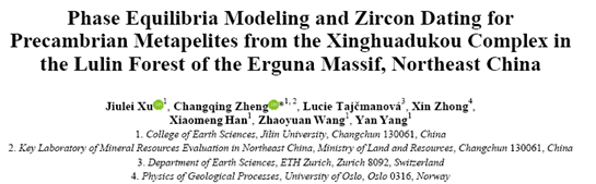 以上研究成果在线发表在地学SCI期刊Journal of Earth ScienceXu, J.L., Zheng, C.Q., Tajčmanová, L., et al., 2018. Phase Equilibria Modeling and Zircon Dating for Precambrian Metapelites from the Xinghuadukou Complex in the Lulin Forest of the Erguna Massif, Northeast China. Journal of Earth Science, 2018, 1-15. DOI:10.1007/s12583-018-0843-z.)。
