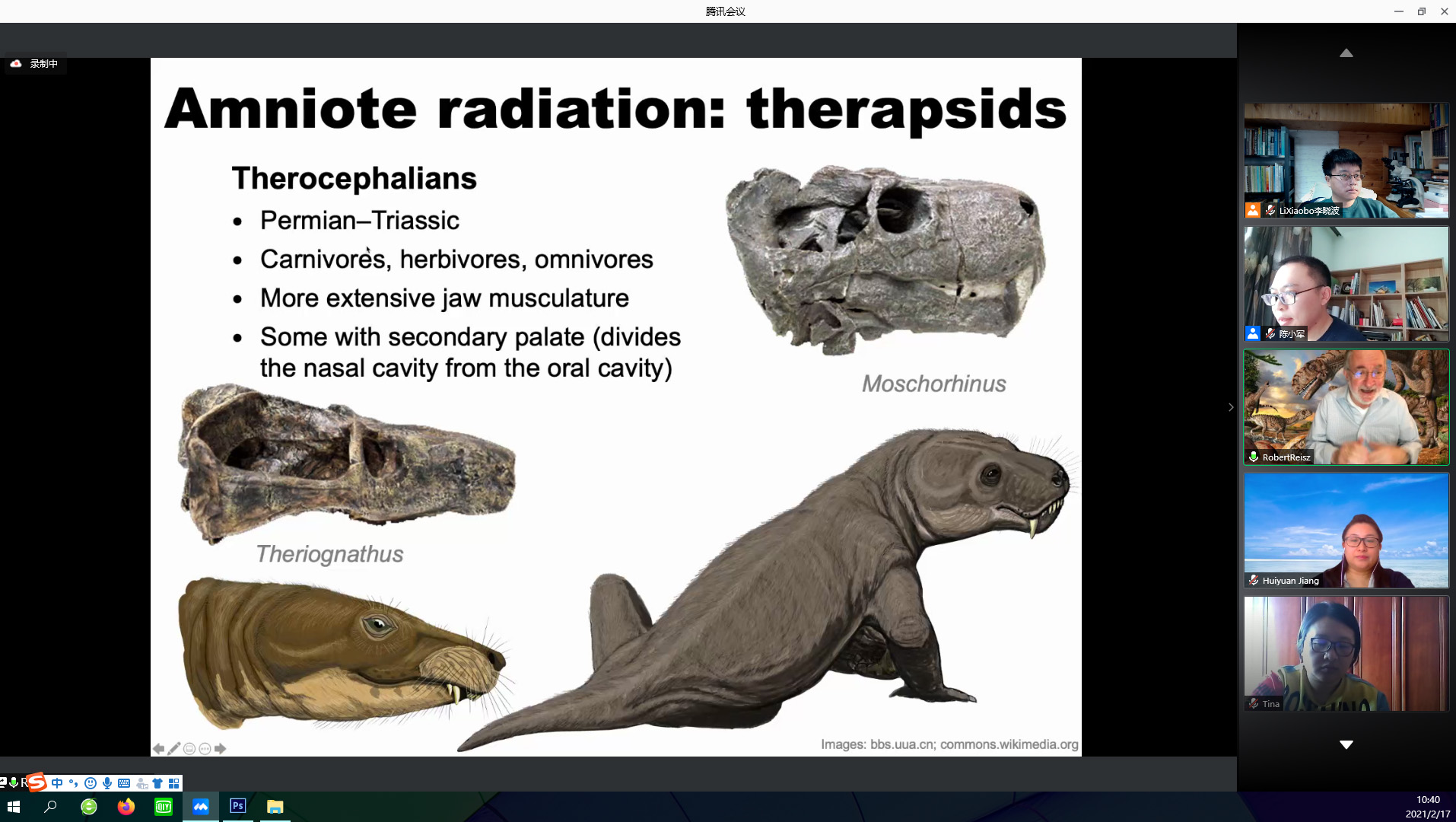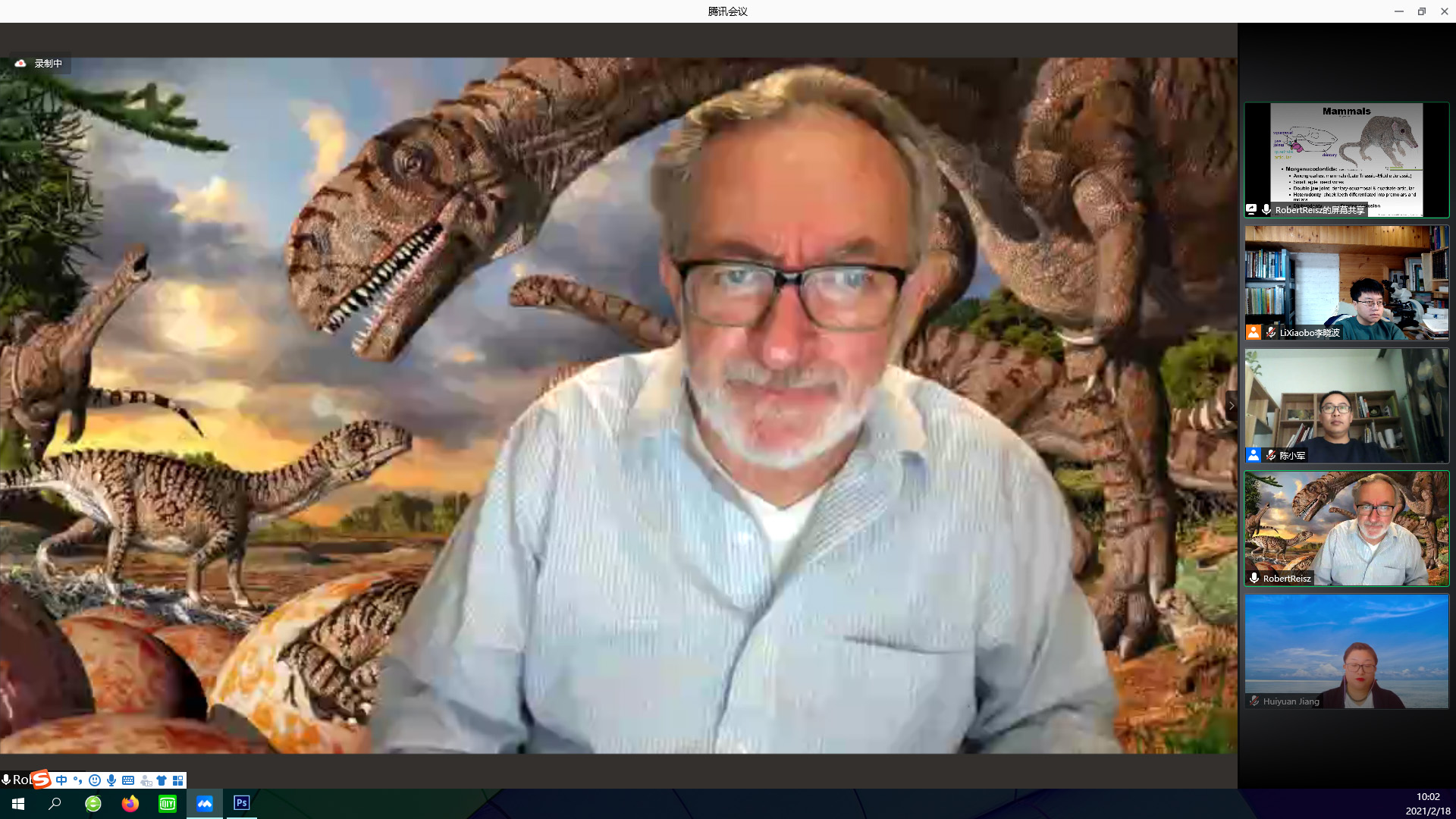 赖兹院士本次讲授课程的题目为《脊椎动物演化的主要特征》,课程时长1周,共计10次在线学习课堂,内容包括古脊椎动物学的基本理论和方法,以及从奥陶纪至白垩纪脊椎动物不同演化阶段的主要特征。开课期间,在线课堂于北京时间每天上午8:45至11:00进行,此时正是多伦多的夜间,赖兹院士克服了时差的影响和白天的劳累,每次课均精心准备、认真讲解,为听课师生奉献了国际最前沿的研究成果和他对经典理论的解析。古生物学与地层学学科的青年老师们认真筹备和组织了这次课程,恐龙演化研究中心的工作人员也做了充分的连线辅助工作。课程期间也正值春节,师生们利用假期时间参与学习,把国际名师课堂当成了提升能力的“新年大礼包”,每天及时上线听课并积极参与讨论。课程的实施充分达到了预期效果,师生们不仅学到了前沿的专业知识,更重要的是拓展了自身的视野,了解了更多的先进研究理念,对于提升科研能力非常有帮助。
